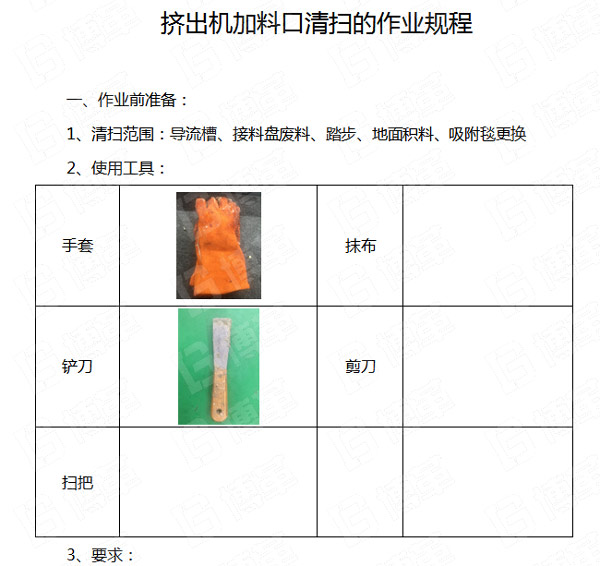 五、通過本次清掃的活動,和員工交流和討論,形成了加料口的清掃作業規程,作業規程共分:作業前準備、作業過程、作業后確認等三個步驟。